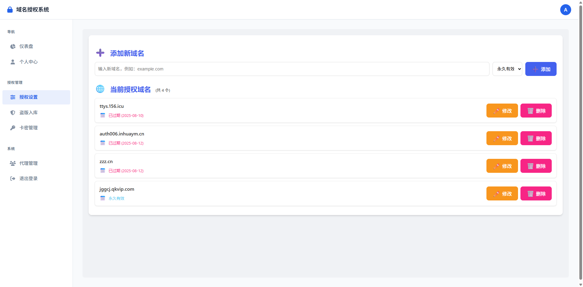 | 这款源码有一个文件有加密,其他的都是开源的,不影响二开,功能也满足日常所需,前端挺简洁美观,支持查询授权、卡密兑换授权、程序下载,更换授权等,自适应手机/电脑端 测试环境:MySQL5.6,PHP7.0 授权支持自定义设置到期时间 支持盗版入库,程序没有授权被使用,会在后台自动生成一个域名访问记录 支持卡密授权 提供授权验证代码,可以直接插入需要授权的程序里 目前支持卡密兑换和后台手动增加,有代理功能,独立代理后台,代理可以无限生成卡密 前台支持自助更换授权,可批量生成,支持自定义设置到期时间 支持代理功能 更新记录: 1.2.0: 6.29更新 1.新增盗版入库功能 1.2.1 7.13更新 1.新增绑定IP功能,双重验证 2.新增验证域名,文件下载功能 3.优化UI 4.修复部分已知bug 1.2.2 8.2更新 1.支持IP或者域名单独授权 define('AUTH_SERVER', 'http://域名/auth_server.php');